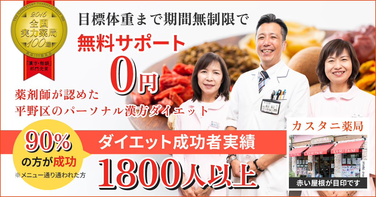 無理なダイエットを繰り返すと筋肉が減り痩せにくくなってきます。カスタニ薬局では、筋肉ではなく体脂肪を落とします。同じ1キロでも筋肉より体脂肪の方が大きいので早くサイズダウンすることが可能です。ダイエット終了後もサイズダウンした体形をキープできる賢いダイエット方法です。また、人それぞれ異なる体質、生活スタイル、食事の時間、食べ物の好み、性格などによってダイエット成功への近道は違います。自分をよく知ることで太りにくい習慣を身につけることが可能です。
